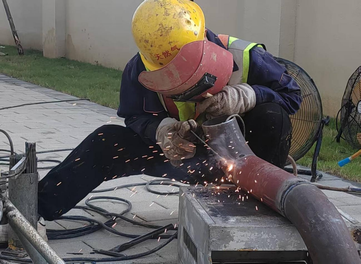 鋼管套絲組巧妙避開烈日,在樓道內(nèi)擺開“戰(zhàn)場”,三臺套絲機同時作業(yè);無縫鋼管焊接和立管、架空管施工的工人則直面高溫——電焊工頂著烈日,一手持護目鏡,一手握焊槍,超過1000℃的焊花飛濺間,周圍空氣仿佛在“咆哮”中蒸騰,厚重的防護服被汗水浸透,很快就泛出一層鹽漬,但他們依然專注操作,確保每道焊縫都焊出合格的魚鱗狀;架空管施工員站在3米多高的鋁梯上,系著安全帶,咬著牙用板鉗緊固管件,臉上豆大的汗珠滑落也無暇擦拭。